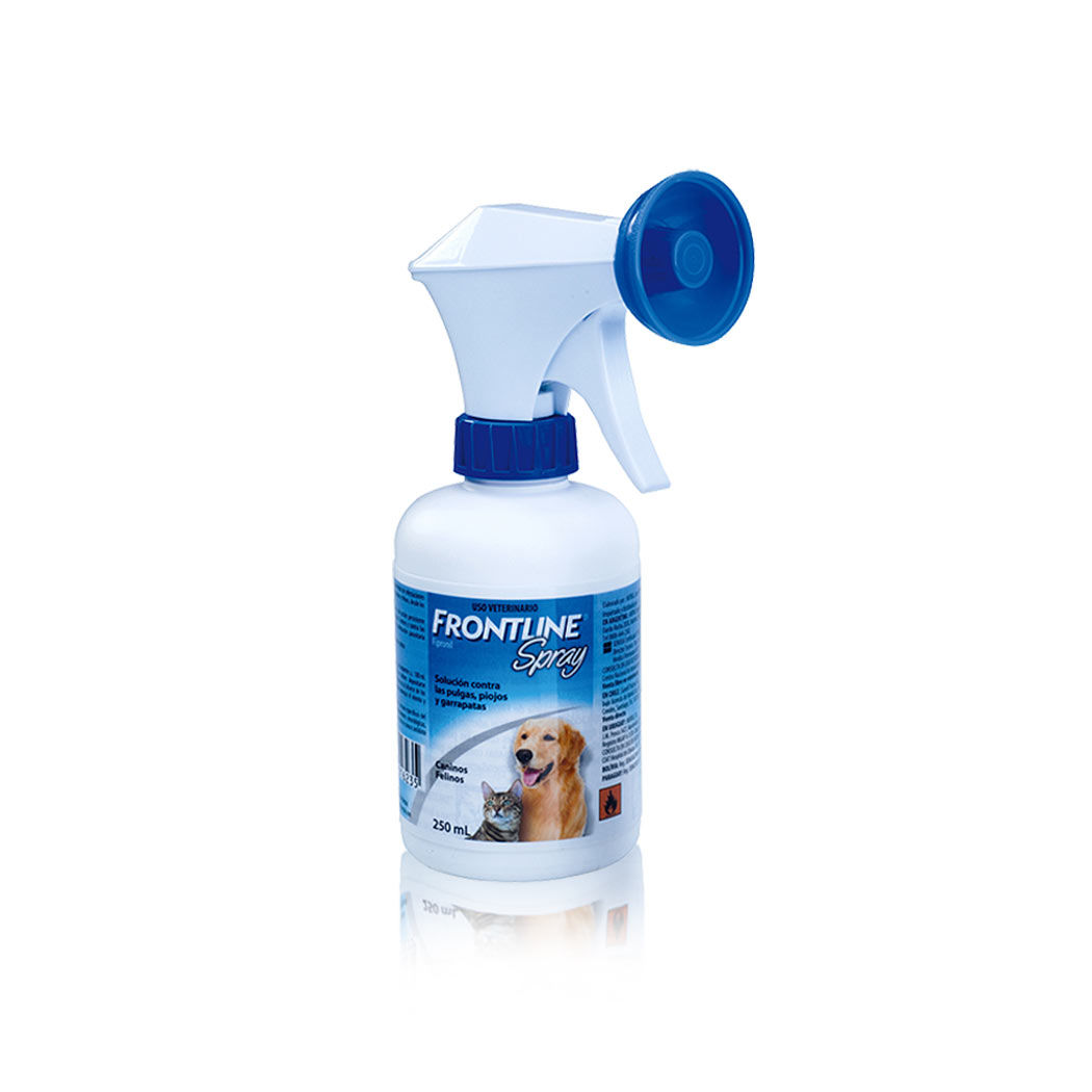 Solución contra las pulgas, piojos y garrapatas. Envase de 100 ml para caninos y felinos. Recomendación: • La opción más segura para cachorros y gatitos. • Infestaciones de pulgas, piojos o garrapatas ya presentes en el animal, aunque el producto también protege durante mínimo un mes. • Hogares con múltiples mascotas. Cómo aplicar: • La dosis recomendada de FRONTLINE SPRAY es de 3 a 6 ml por kilogramo de peso (depende de la longitud del pelo de su mascota; ver instrucciones). • Aplicar en el sentido contrario al crecimiento del pelaje y asegúrese de que todo el manto o pelaje esté empapado con el producto. • En caso de alto riesgo parasitario o de animales con pelo muy largo y/o muy grueso: aplique FRONTLINE SPRAY a la dosis más alta (6 ml/kg). • Para la aplicación en la zona de la cabeza en animales nerviosos o jóvenes, se recomienda ponerse guantes, aplicar FRONTLINE SPRAY en ellos y luego frotar sobre la zona en cuestión. Número de aplicaciones: Frasco de 100 ml: 6 a 12 pulverizaciones por kg.