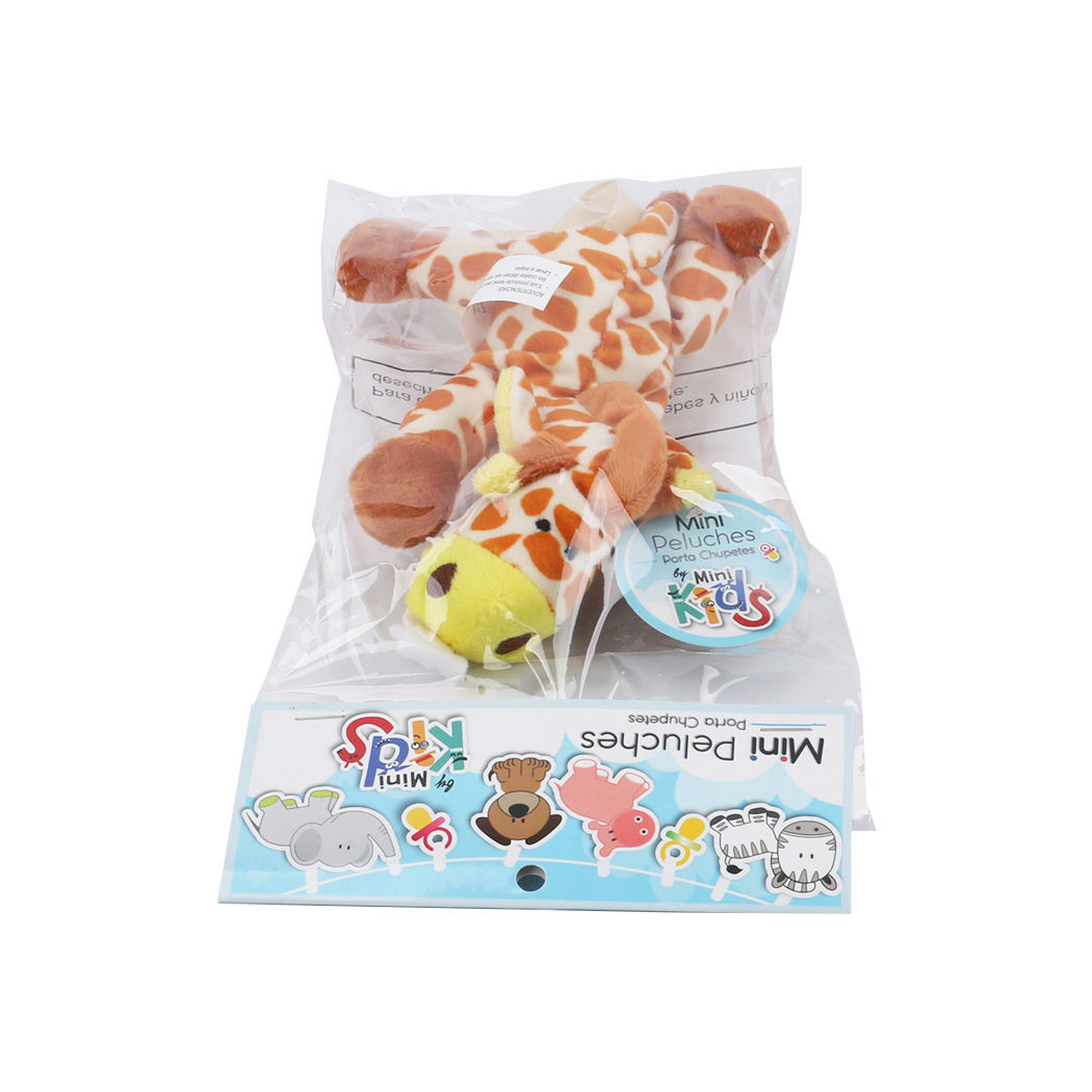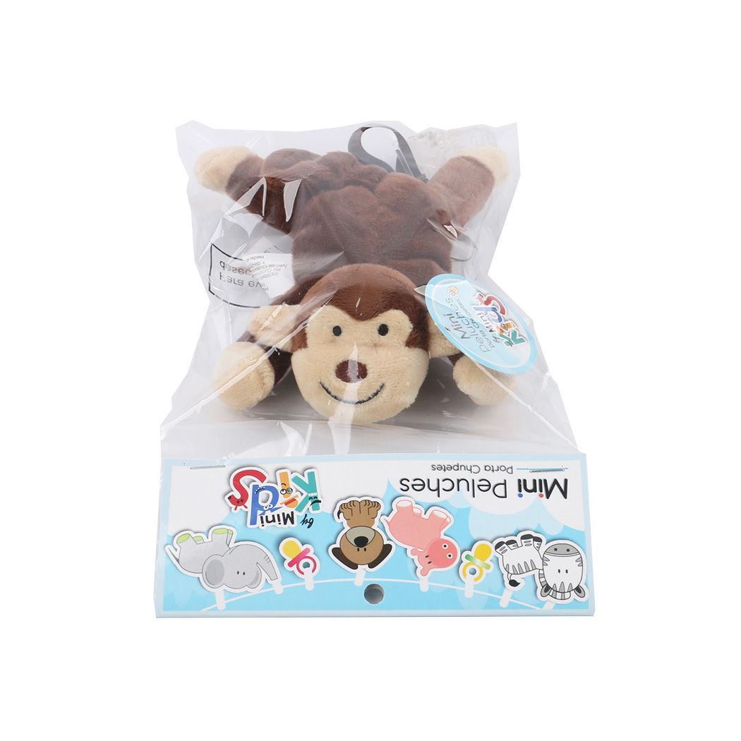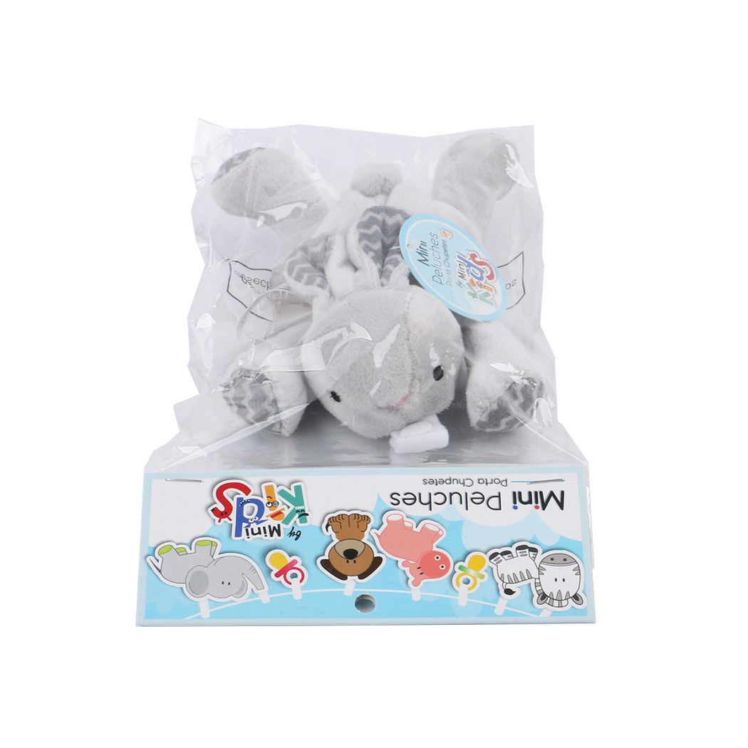 Mini peluche porta chupete con correa y gancho con ocho diseños atractivos para el bebé: Perro, conejo, hipopótamo, elefante, girafa, mono, sebra y elefante. Incluye correa y gancho. Importante: No incluye chupete.