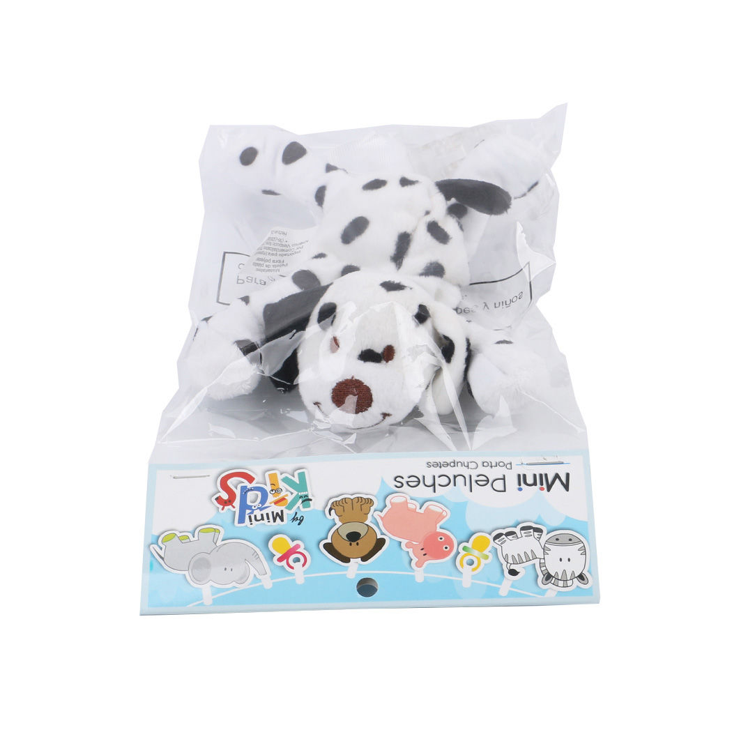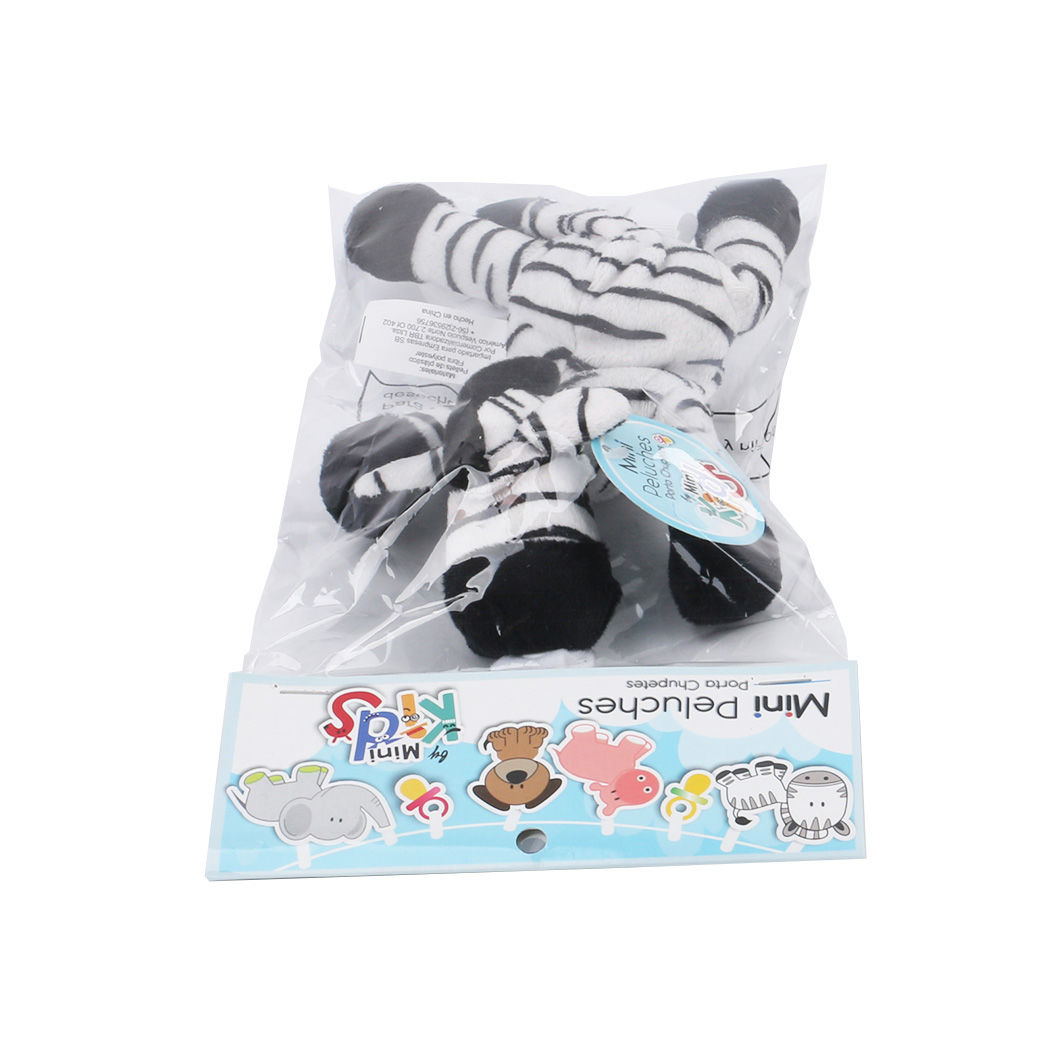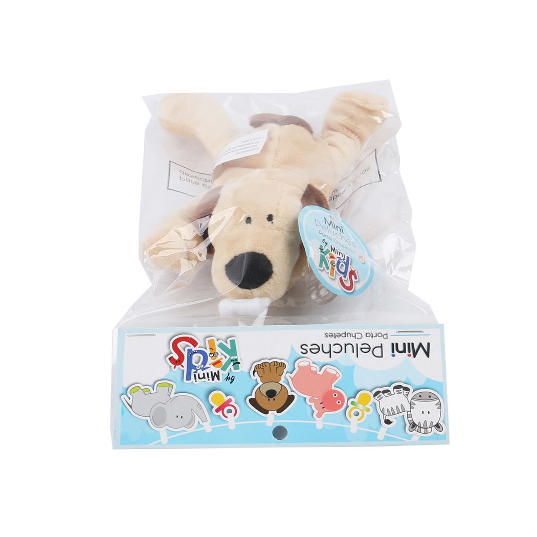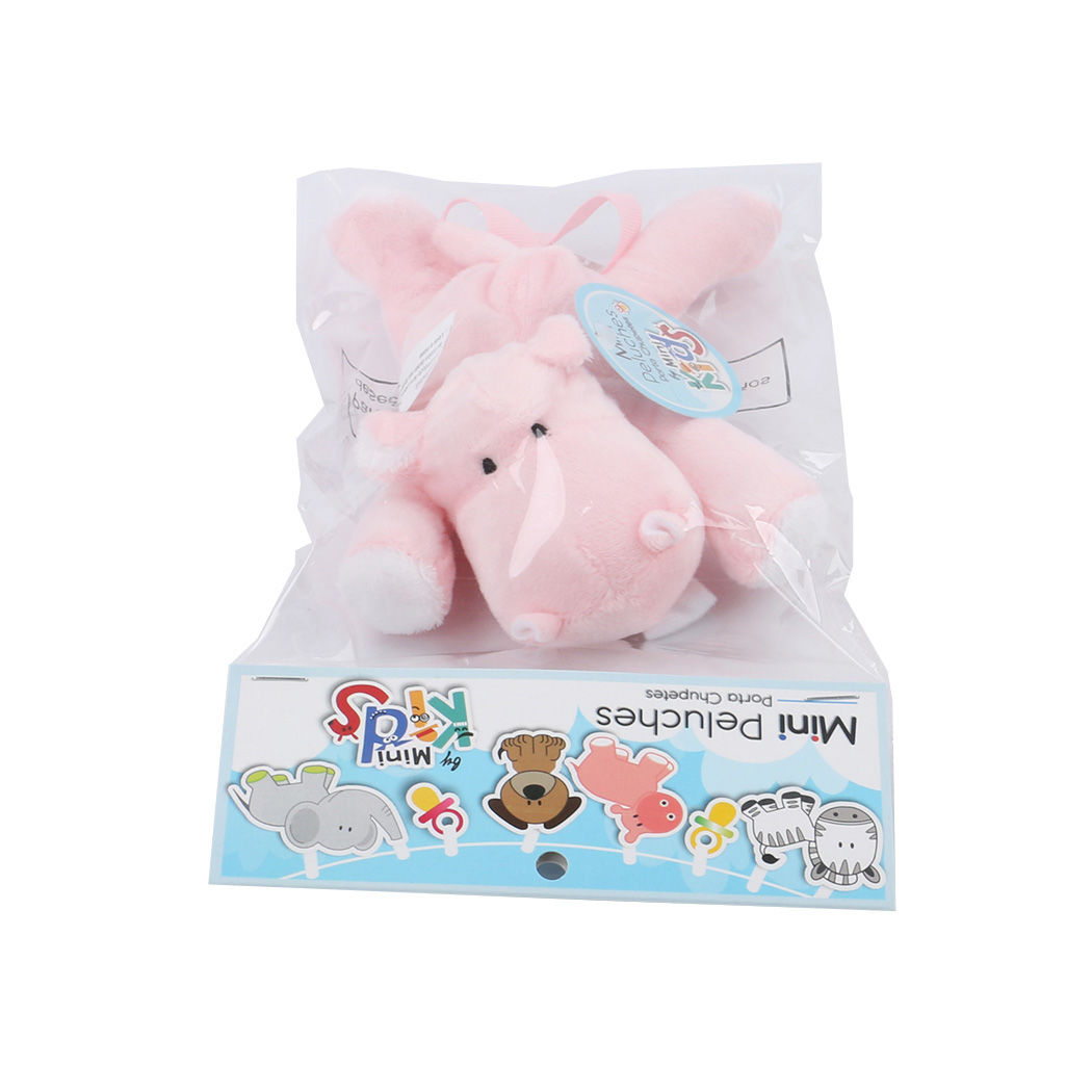 Mini peluche porta chupete con correa y gancho con ocho diseños atractivos para el bebé: Perro, conejo, hipopótamo, elefante, girafa, mono, sebra y elefante. Incluye correa y gancho. Importante: No incluye chupete.